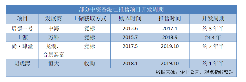 如中海最早在香港启德开发的启德一号项目,于2013年6月竞得地皮,于2017年初首次推出;万科在香港首个单独操作的香港项目上源,于2015年7月以逾38亿港元中标,于2018年9月首次销售。