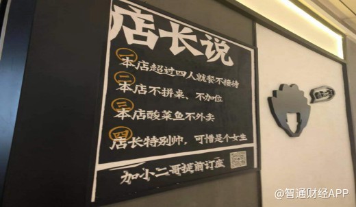 “超过四人就餐不接待”、“不拼桌、不加位”、“酸菜鱼不外卖”,这些奇葩的店规明目张胆的张贴在每一家太二酸菜鱼的店门口。在常人看来,这是妥妥的“顾客人数歧视”、“销售渠道歧视”,简直离经叛道。