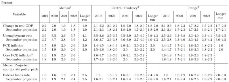 2019年GDP增速预期中值为2.2%,9月预期为2.2%;2020年GDP增速预期中值为2.0%,9月预期为2.0%;2021年GDP增速预期中值为1.9%,9月预期为1.9%;2022年GDP增速预期中值为1.8%,9月预期为1.8%;长期GDP增速预期中值为1.9%,9月预期为1.9%。