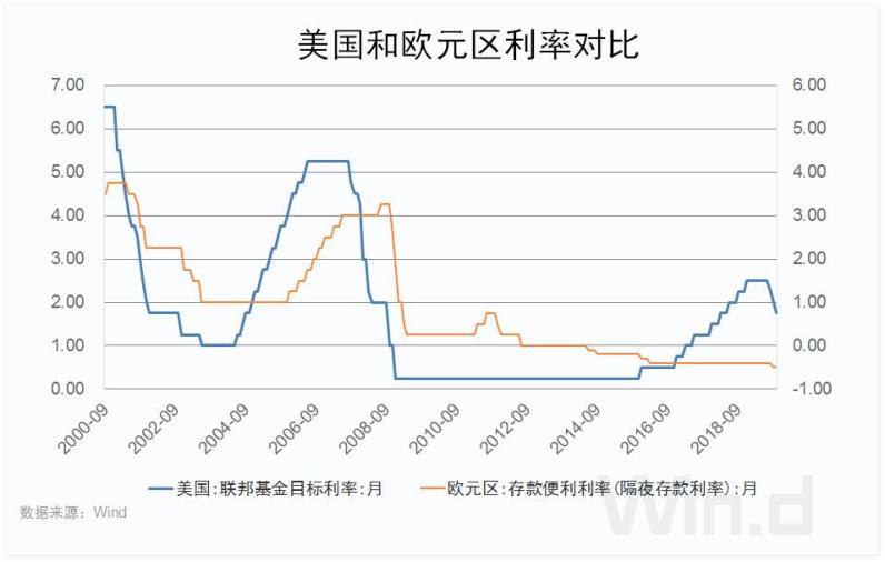 德拉吉在卸任欧洲央行行长之前,几乎在货币政策上火力全开,不仅降息10个基点,还重启了QE。从今年的经济数据表现来看,欧元区的数据表现差于美国,如果欧洲央行想要支持欧元区经济增长,至少从利差的角度来看,欧元区需要比美国更低的利率。因此,美联储暂缓降息,也减轻了欧洲央行在短时间内继续深化负利率的压力。一般来说,除了鹰派的货币政策预期能够提振汇率之外,鸽派预期减弱同样有助于提振汇率走势。