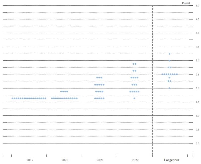 2019年底联邦基金利率预期中值为1.6%。2020年底联邦基金利率预期中值为1.6%。2021年底联邦基金利率预期中值为1.9%。 2022年底联邦基金利率预期中值为2.1%,9月预期为2.4%;长期联邦基金利率预期中值为2.5%,9月预期为2.5%。