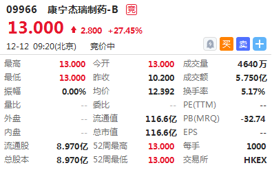 华盛资讯12月12日周四消息,生物制药公司康宁杰瑞制药-B今日于港交所正式挂牌,首日高开27.45%,报价13港元 ,截止9:26,成交额5.75亿港元 ,最新市值116.6亿港元。此前该股在暗盘交易中收涨25.10%,一手可赚2560港元。