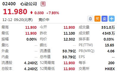 游戏开发商心动公司首日高开7.93%,报价11.98港元 ,截止9:26,成交额4345万港元 ,最新市值50.79亿港元。此前暗盘收涨11.17%,暗盘一手可赚248港元。