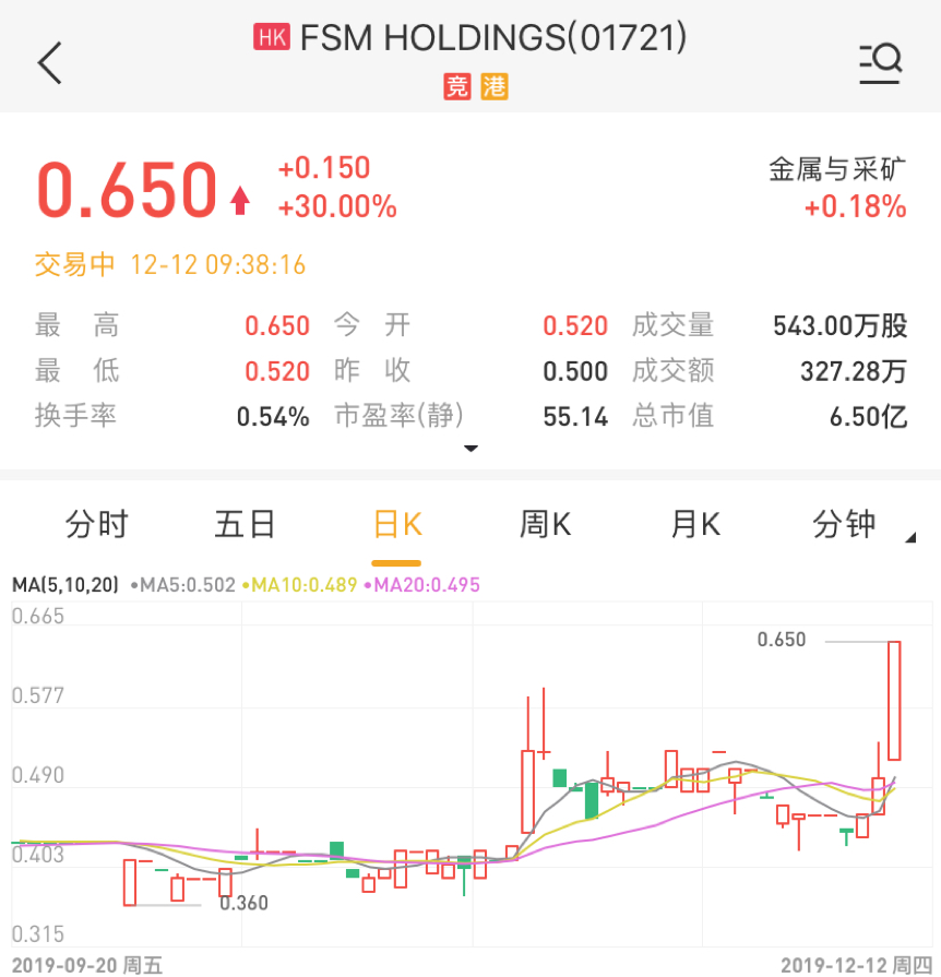 华盛资讯12月12日讯息,字母股FSM HOLDINGS(01721)盘中异动。截至发稿,公司股价大幅上涨30%,现报0.65港元,当前成交量543万股,成交额327.28万港元,换手率为0.54%。