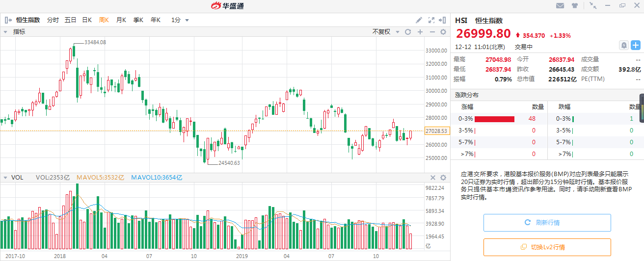 2019年的港股指数可用“历经波折”来形容,截止2019年12月11日收市,全年涨幅仅3%左右,远低于标普500指数的24%和上证指数的17%。
