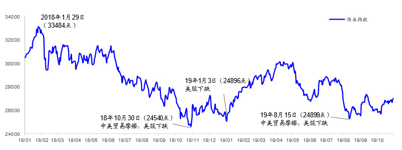 3、从9月份开始,外部风险边际好转,加上港股中报中资红筹股业绩好于悲观预期,港股“估值弹簧”出现向上弹性,但在大市上攻的过程中仍受中美贸易谈判、香港事件反复等因素掣肘。