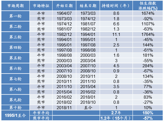 从历史统计数据上来看,1964年以来港股已经经历了9轮的牛熊周期,而从2018年11月以来开始进入到第十轮牛市的初期。从1995年以来港股牛市平均持续约3年,而熊市平均15个月。