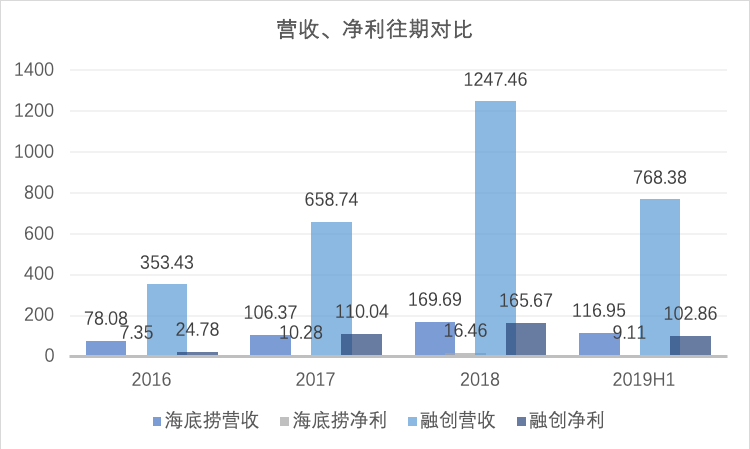 而如果对比业绩,2019年上半年融创营收为768.4亿元,归属股东利润为102.9亿;海底捞2019年上半年营收为116.9亿,归属股东利润为9.11亿。