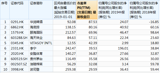 这也某种程度上反映了2019年港股的一个现象,那就是许多消费股涨幅惊人,估值也抬升到了惊人的高度。