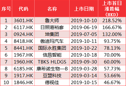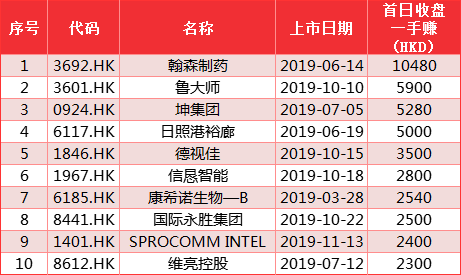 我们同样排列出前十个股,翰森制药、鲁大师、坤集团首日一手收益分列前三,收益为10480港元、5900港元、5280港元。可以看到收益靠前的个股基本都在下半年上市。