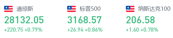 截至收盘,标普500指数涨26.90点,涨幅0.86%,报3168.58点;纳指涨63.30点,涨幅0.73%,报8717.32点;道指涨220.80点,涨幅0.79%,报28132.12点