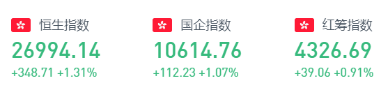 恒生指数开盘高开0.72%,早盘持续攀升,随后横盘震荡至收盘。截至收盘,恒生指数涨348.81点或1.31%,报26994.14点,全日成交额达908.57亿。国企指数涨1.07%,报10614.76点,红筹指数涨0.91%,报4326.69点。