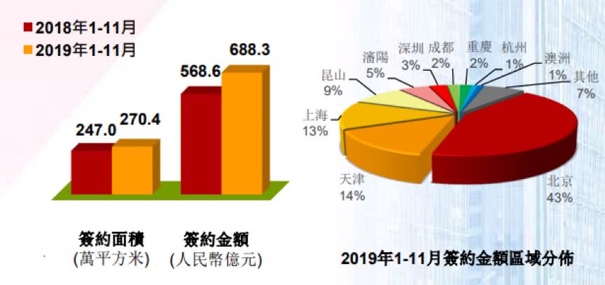 最新披露的11月销售数据显示,首创置业当月实现签约金额86.8亿,其中京津沪地区47.9亿。1-11月累计实现签约金额688.3亿,同比增长21.0%。从签约区域构成来看,北京、天津两地的占比超过五成,其他占比较大的区域还包括上海、昆山、沈阳以及深圳等。