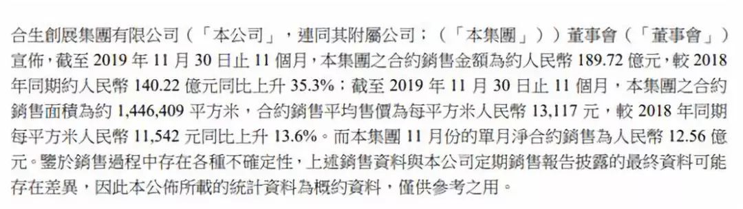 1-11月份,合生创展累计销售额为189.72亿元,较上年同期增加49.5亿元,同比增加35.3%。