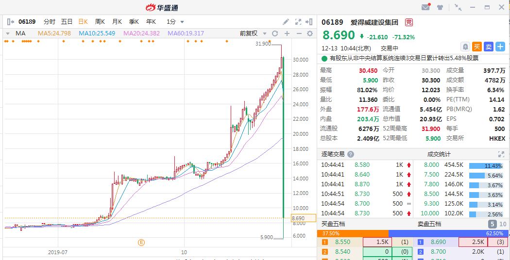 格隆汇12月13日丨爱得威建设(6189.HK)盘中跳水,一度跌超80%至5.9港元,创2017年11月以来新低。最新报8.69港元,跌71.32%,暂成交4782万港元,最新总市值20.93亿港元。