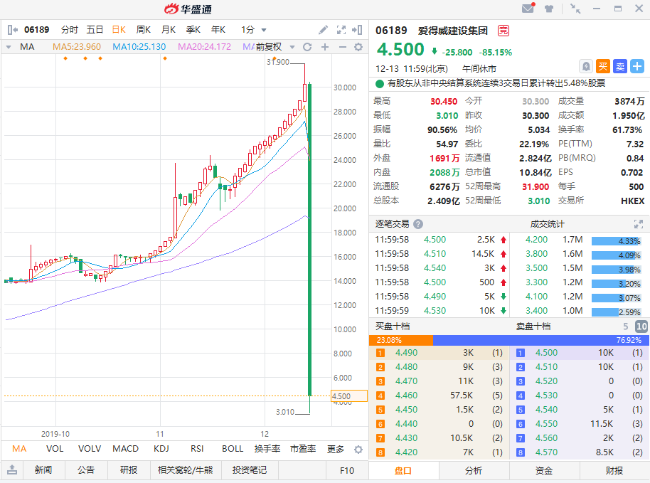 提起妖股就不得不提今天的爱得威建设集团,不久之前才创了新高,但今天盘中15分钟内便抹去了过去5月的涨幅,且还创出2年新低,让投资者瞠目结舌。不少投资者趁机抄底,但如果稍有不慎,变会偷鸡不成蚀把米,变成接盘侠。原本的持有者心里更是难受,一下从巨赚变成巨亏,心里苦不堪言。
