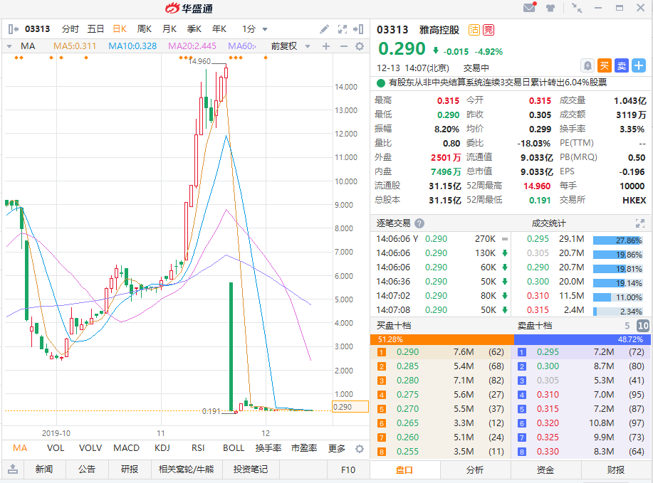 除了平安证券集团控股、广泽国际发展、南方能源、雅高控股,2019年的市场上还有不少在短短数日暴涨、暴跌的个股,每只个股都可能让相关投资者心中苦涩或笑逐颜开。但2020年即将到来,投资者要对于过去2019年发生的这些把戏心存忌惮。祝2020年每个投资者都能有比2019年更好的投资回报。