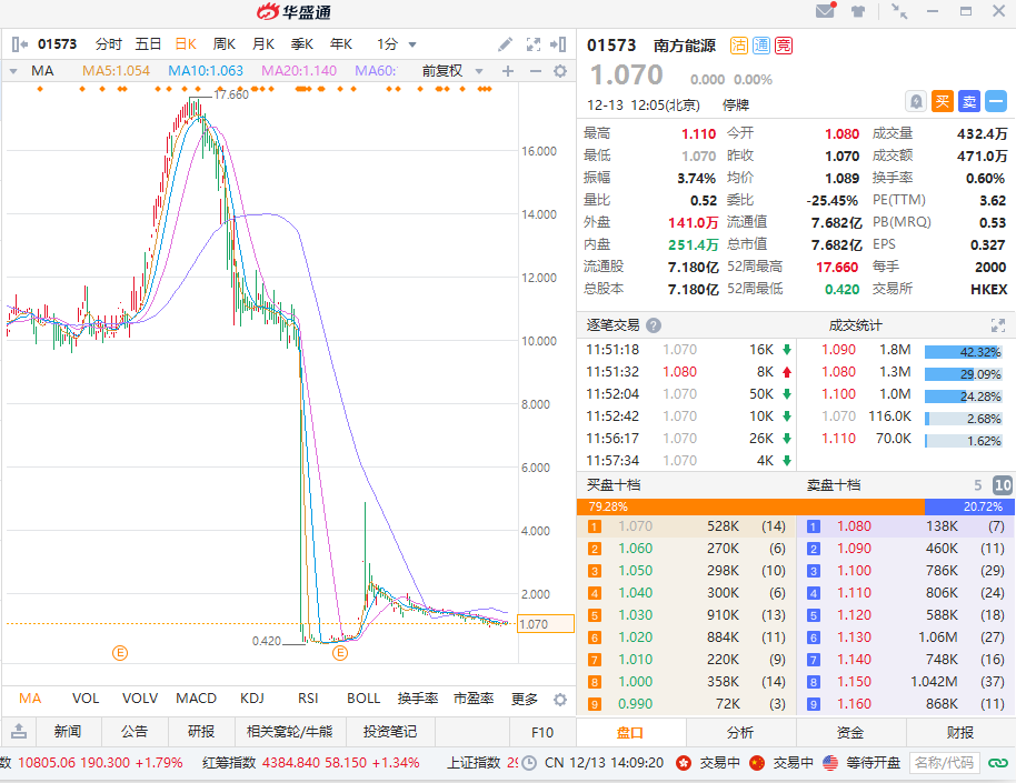 除此之外南方能源还遭到了股东的清仓式减持。8月9日,南方能源公告称,董事会获公司控股股东及董事会主席徐波通知,自8月5日至8月7日,由公司控股股东Lavender Row Limited持有的约2.27亿股公司股份已于市场出售,约占公司已发行股本的31.63%。虽然所有人都知道南方能源是老千股,但由于港股通的进入准则是计算一段时间内的平均市值,妖股南方能源依然达到了标准,进入了港股通。