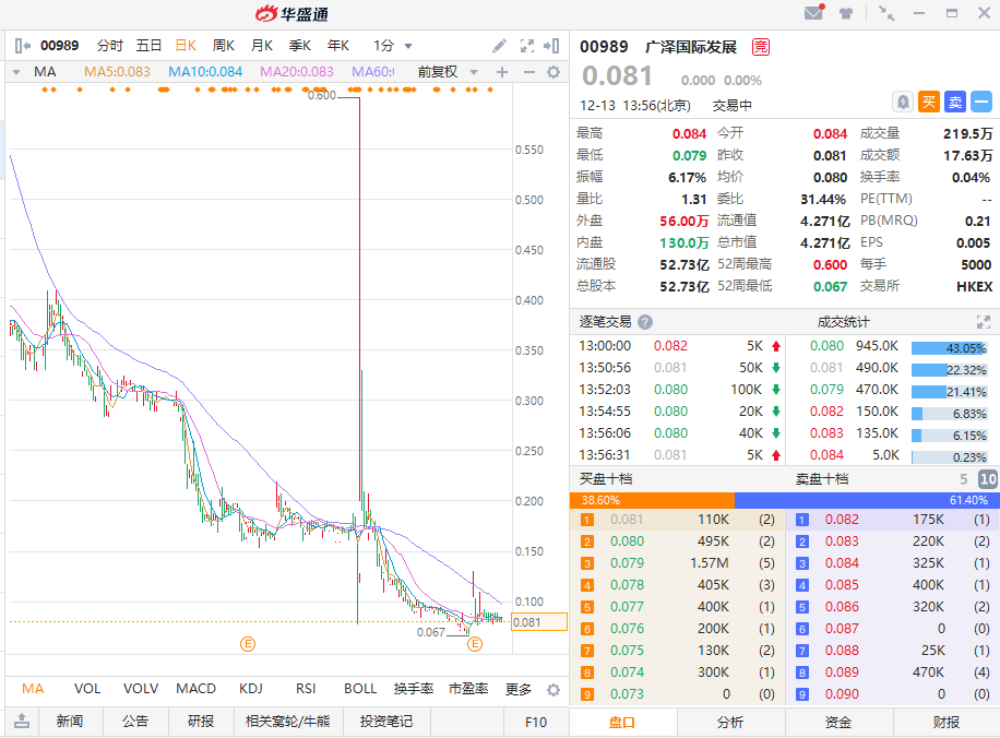 但短暂的上涨之后,随后的一个消息,让所有投资者傻了眼。大股东是爆仓了,但是只是合计爆了0.15%。所有投资者意识到,这根本不是传统意义上的爆仓,随后广泽国际发展便开始了无尽的下跌。