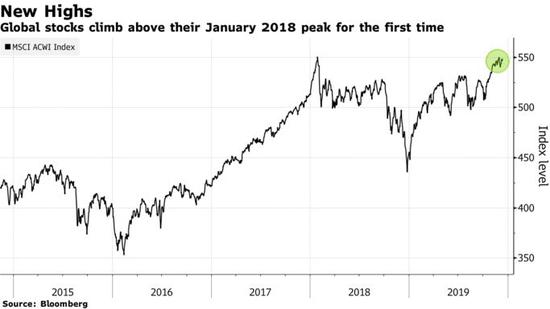 追踪49个国家和地区股票的MSCI全球所有国家指数(MSCI all-country world index)升至551.84点,超过了2018年1月29日创下的纪录550.63点。
