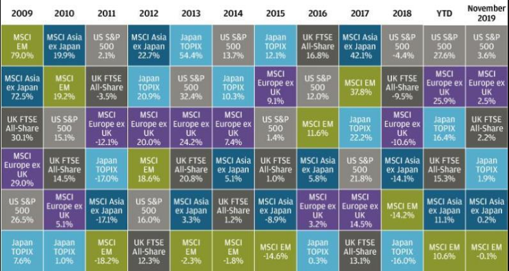 截止2019年11月来看,标普500的涨幅傲视全球,排其后的是欧洲股市,达到25.9%;而作为大摩看好的新兴市场指数涨幅仅有10.6%。这样看来美银美林和大摩的脸还是被打得比较厉害的,预测基本相反了。
