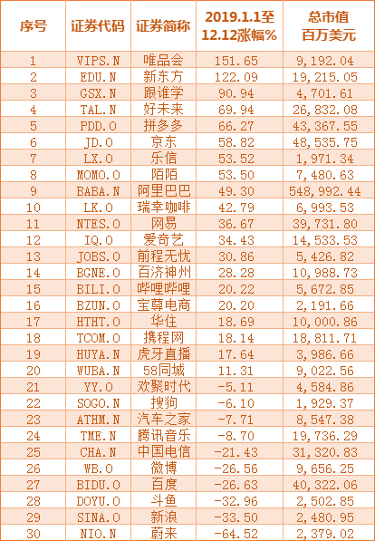 截止2019年12月12日收市,电商唯品会以年度151%涨幅登顶中概股涨幅榜。