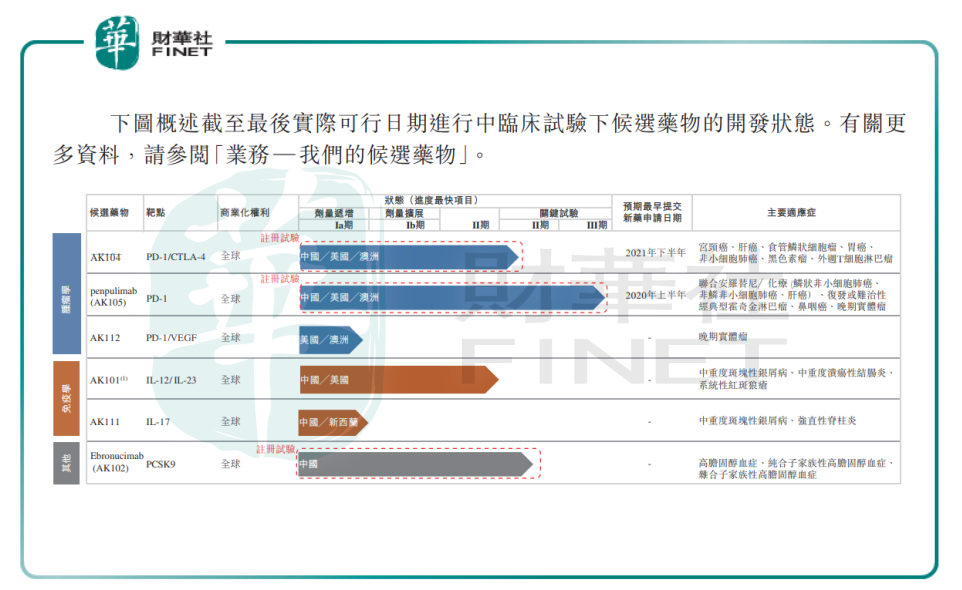 但有所不同的是,康方生物还有与大型制药企业(中国生物制药(01177-HK))组成合营公司共同开发抗体,以中国生物制药以现金出资、康方生物以知识产权和相关技术权益作为无形资产出资的形式进行。因此康方生物的在研管线分自有权利药物、授权药物、共同开发药物等等。