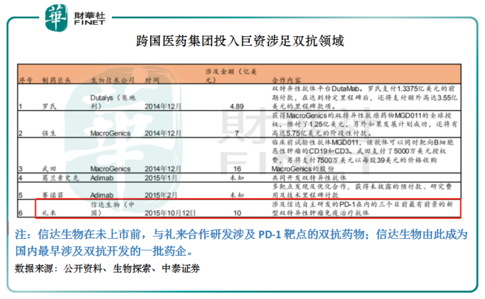 在肿瘤治疗中显示出完全缓解的临床试验结果并通过审批上市,有力证明了双抗是一种行之有效的抗体药物,可用于对应适应症的一线治疗。从2014年年底开始,强生、罗氏、赛诺威等大型跨国药企以收购创新型生物公司及产品管线或合作的方式涉足双抗领域,总投资额接近40亿美元。