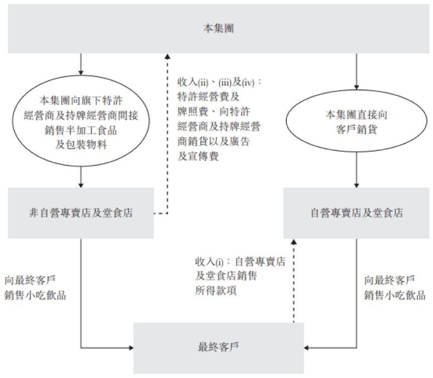 公司业务采用两种经营模式,一种是自营模式,通过自营专卖店和堂食店向最终客户销售小吃饮品。另一种是特许经营及牌照模式,通过向特许经营商及持牌经销商销售半加工产品及包装物料、收取特许经营费和牌照费、收取广告及宣传费来获得收入。