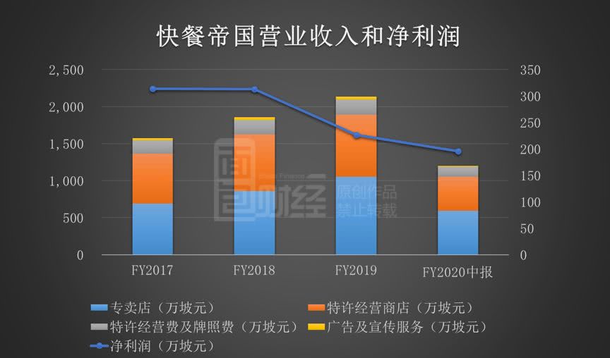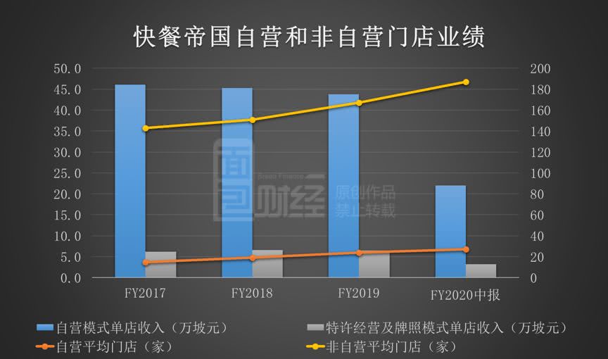 2017财年至2020财年中报期,快餐帝国自营门店的单店收入分别为46.1万坡元、45.2万坡元、43.8万坡元和22.0万坡元;非自营门店的单店收入分别为6.2万坡元、6.6万坡元、6.5万坡元和3.2万坡元。