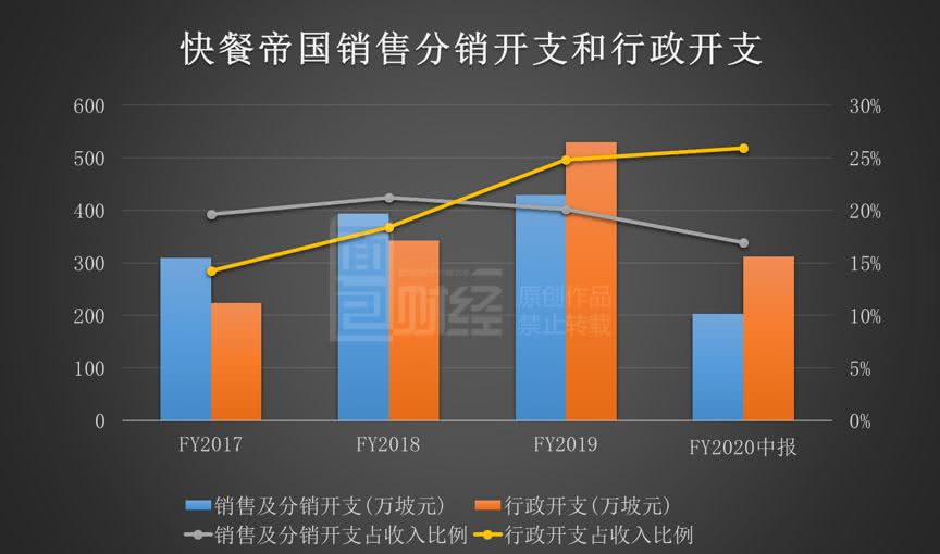 但2020财年中报期间,快餐帝国在营业收入和门店数量均有所增加的同时,其销售及分销开支却同比下降。这一财务现象留有疑问,但公司在报告中并未披露相关详细信息。