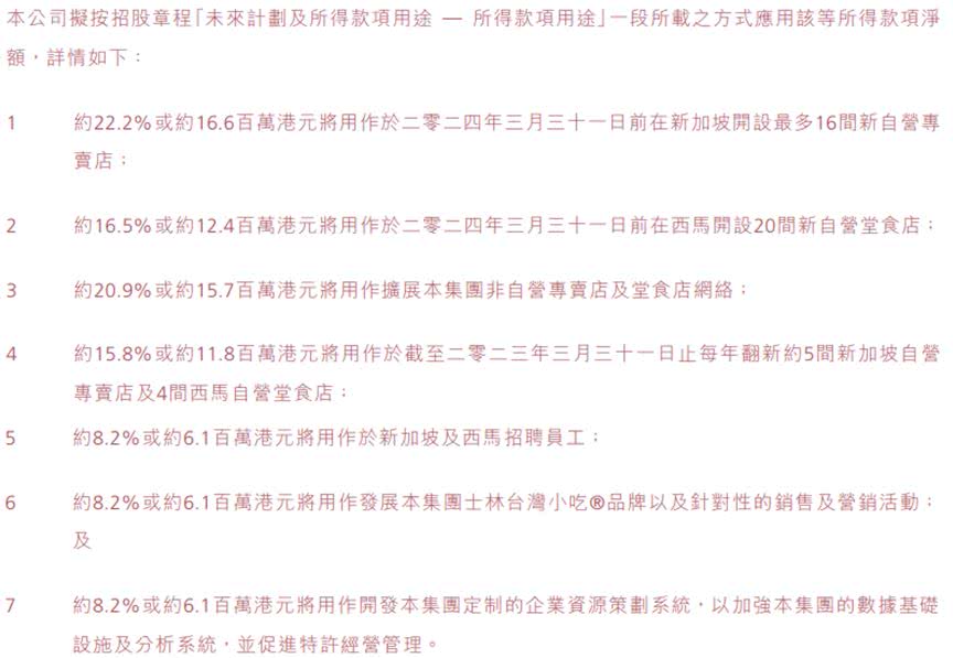 公司拟将募集的资金拿出75%用于扩大门店网络,包括开设和翻新自营店,以及扩展非自营店,剩下25%的资金则计划在新加坡和马来西亚招聘员工、促销和开发企业ERP系统。