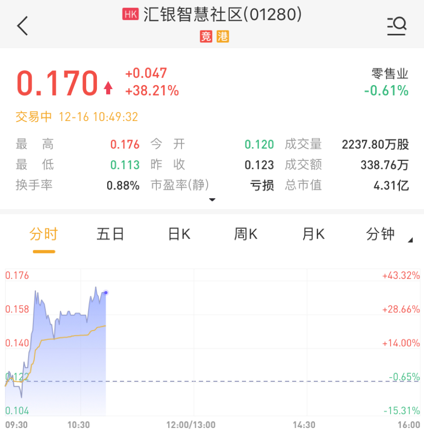 华盛资讯12月16讯息,汇银智慧社区(01280)盘中异动。截至发稿,汇银智慧社区大幅上涨38.21%,现报0.17港元,当前成交量2237.8万股,成交额338.76万港元,换手率为0.88%,当前总市值4.31亿港元。
