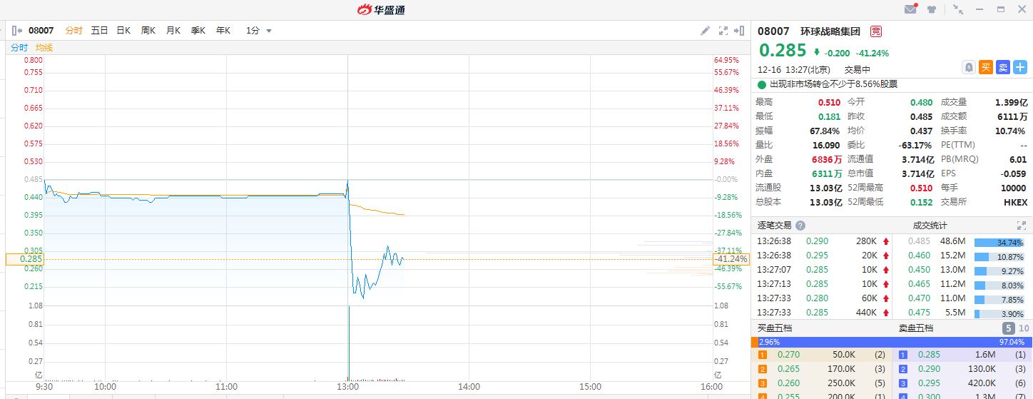 新浪港股讯 12月16日消息,环球战略集团午后一度暴跌60%,最低报价0.18港元。目前跌41.24%。