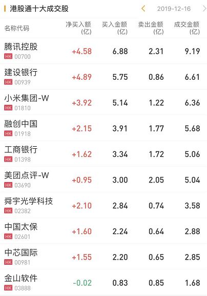 港股通资金今日净流入港股51.62亿元。净买入建行4.89亿港元,腾讯4.58亿港元,小米3.92亿港元,南下资金已连续10日净流入小米集团,累计约24.596亿港元。净卖出金山软件0.02亿港元。