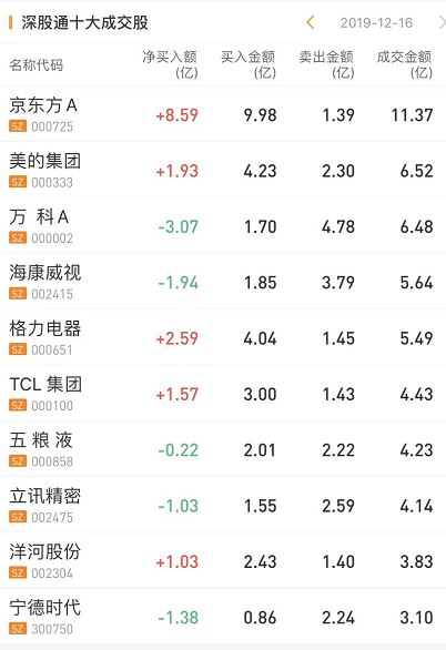 深股通净买入京东方8.59亿居首;净买入格力电器2.59亿;净卖出万科A 3.07亿。