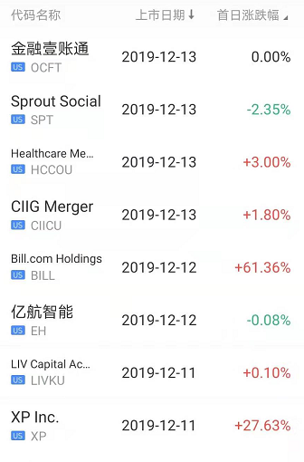 上周美股市场出现一只大涨新股,知名云软件服务商Bill.com首日61.36%的涨幅让人大为惊艳,使得另一只同样拥有云技术的新股略显逊色,归于平安旗下的金融壹账通表现低于预期,盘中破发最终平收,另一只中概股国内的无人机品牌“亿航”首日同样也是平淡无奇,跌0.08%。