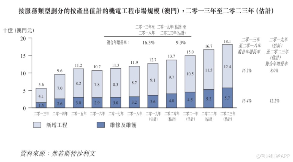 弗若斯特沙利文报告显示,由于旅游业和娱乐业蓬勃发展,2013年至2018年,由于新增楼宇的建设及机电工程的需求增长,澳门新增工程分部由41亿澳门元增加至87亿元,复合年增长率为16.2%。商业分部的新落成楼宇数量不断增加,促使对机电系统的安装需求增长。新增工程分部预期于2019年至2023年以8%的复合年增长率增长。