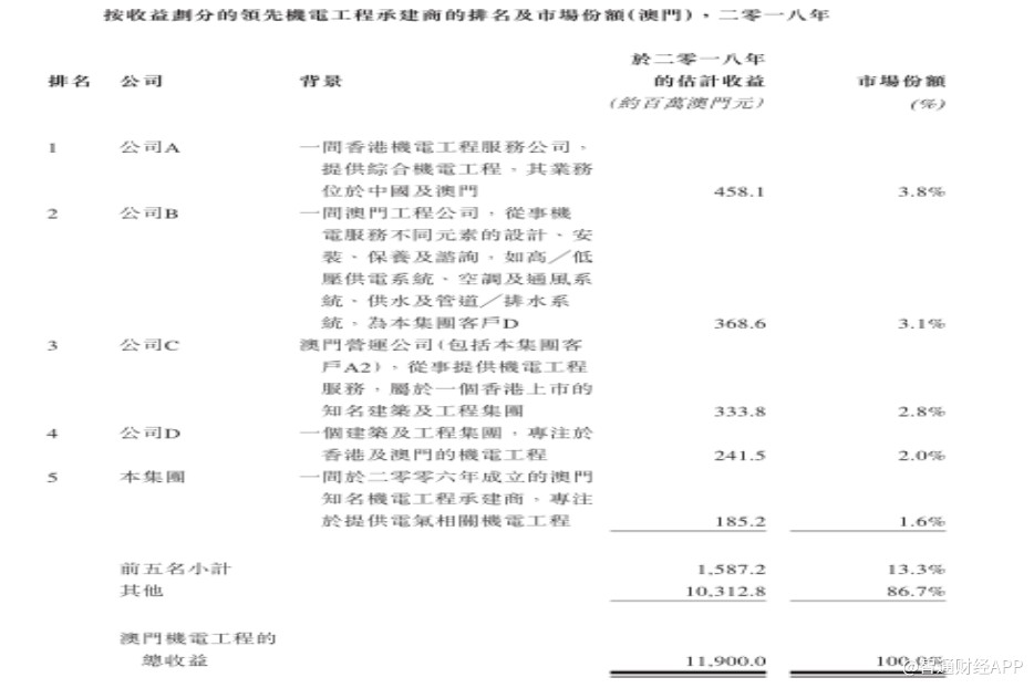 根据弗若斯特沙利文报告,2018年澳门有200多间机电承建商,澳门的机电工程行业高度分散,前五大参与者占2018年机电工程服务收入的约13.3%。在2018财政年度。澳达来自澳门机电工程的收入占澳门整个机电工程行业总收入约1.6%,按占2018年行业总收入的份额计,公司在澳门机电工程承建商中排名第五。