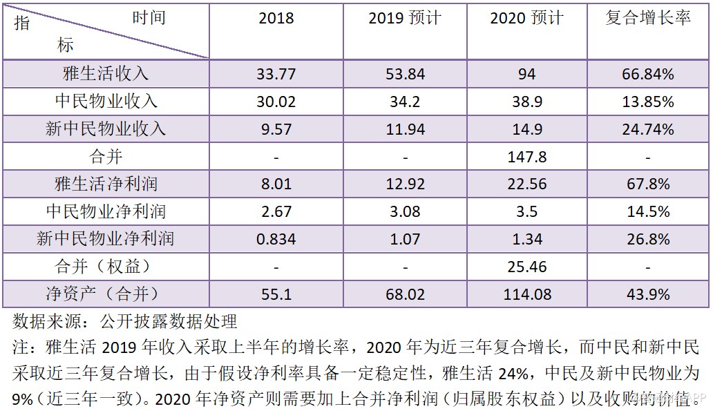 由于2019年临近年底,预计该公司对中民项目收购在2020年上半年完成并实现并表,根据测算,2020年,雅生活合并后的收入将为147.8亿元,归属于股东净利润将为25.46亿元,净资产将为114.08亿元,以目前的市值算,对应的PS、PE及PB分别为2.2倍、12.66倍及2.82倍。