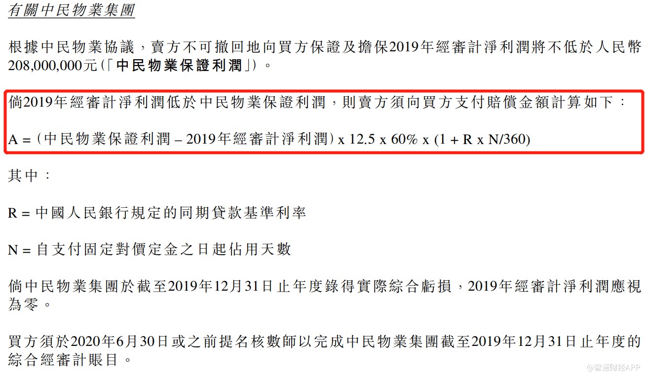 赔付金额=(保证利润-2019年经审计净利润)*12.5*60%*(1+R*N/360),倘若经审计的净利润≤0,不包括利息,雅生活收回了15.6亿元的投资,相当于钱不是白给的,如果业绩达不到要求,钱不仅要收回,而且还收被占用时间的利息。新中民物业的对赌公式和中民物业一致,雅生活在整个协议都占尽了便宜。