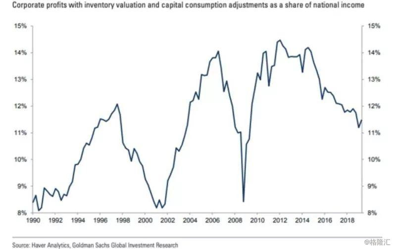 此外,针对下面的图表,高盛表示尽管盈利增长可能在2020年出现反弹,但以后危机时期的标准衡量,未来的增长轨迹将会平缓得多,因为企业利润会根据新的因素进行调整,即劳动力成本的增长速度超过了物价上涨的速度。他们表示企业盈利前景相当黯淡,会引发了对更广泛宏观前景的担忧。