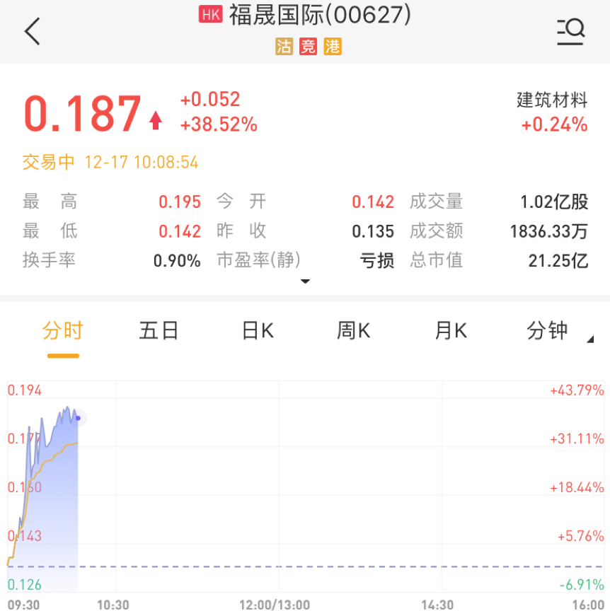 华盛资讯12月17日讯息,福晟国际(00627)盘中异动,一度大涨超40%。截至发稿,福晟国际大涨38.52%,现报0.187港元,当前成交量1.02亿股,成交额1836.33万港元,换手率0.90%,当前总市值21.25亿港元。