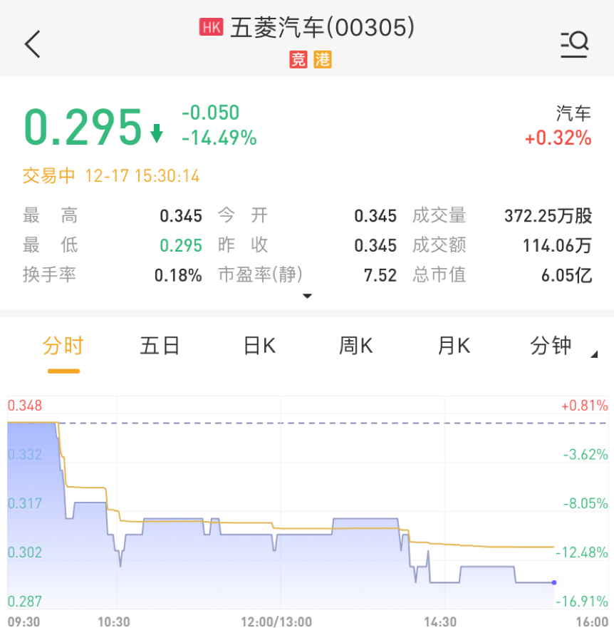 华盛资讯12月17日讯息,五菱汽车(00305)盘中异动,昨日收涨30%后又迎来大跌。截至发稿,五菱汽车大跌14.49%,现报0.295港元,当前成交量372.25万股,成交额114.06万港元,当前总市值6.05亿港元。