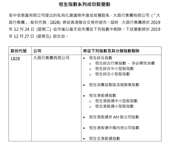 恒生公司:将大昌行集团从恒生综合指数等指数中剔除