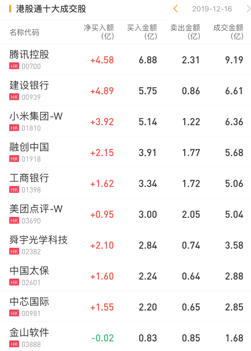 今日南下资金净买入腾讯控股4.58亿港元,净买入小米集团3.92亿港元,净买入美团点评0.95亿港元,净买入建设银行4.89亿港元;净卖出金山软件0.02亿港元。
