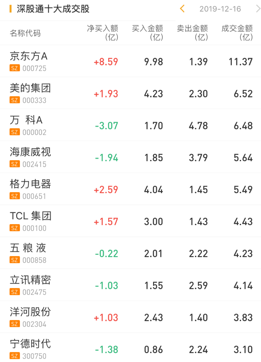 深股通净买入京东方A8.59亿元,净买入格力电器2.59亿元,净买入美的集团1.93亿元;净卖出万科A3.07亿元,净卖出海康威视1.94亿元。