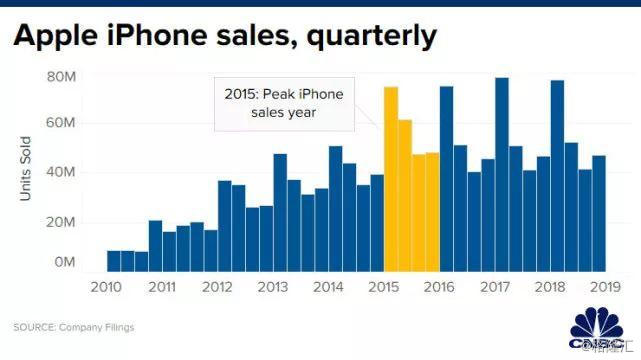 但最大的挑战可能只是因为iPhone是一款千载难逢的产品,不能像过去10年那样快速增长,当时数亿人第一次拥有了iPhone。iPhone的销量在2015年达到峰值,为2.31亿部。自那以后,它们基本上持平。2019年,苹果表示不再计划报告销量数字,这表明总收入和其他指标对投资者来说已经能够提供足够多的信息。