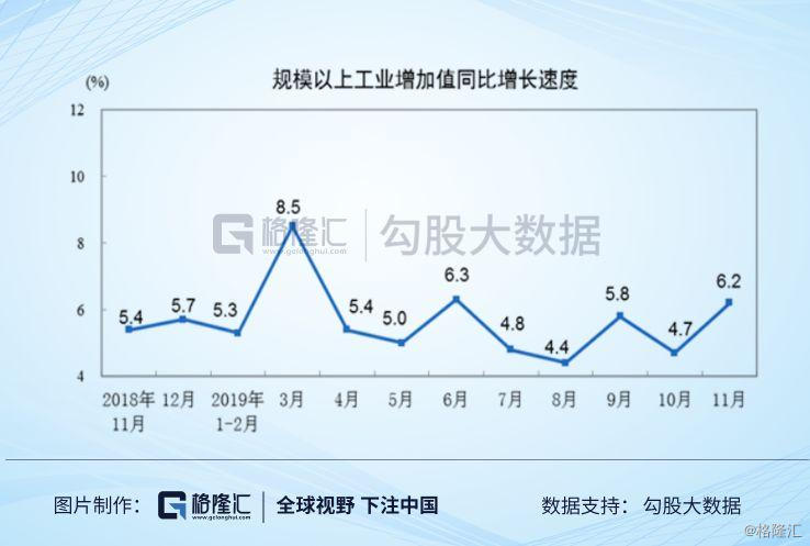 11月份的工业增加值当月同比增加了6.2%,较10月份有一个很大的回升,10月是4.7%,9月5.8%。9月其实就有企稳迹象,但10月又掉下去了,现在11月重新回到了6,但是否持续有待观察。