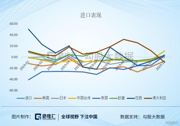 另外,进口是其他国家的GDP,但反映的是我们国家的经济景气度。11月进口出现了明显好转迹象,美元计价的进口同比增长0.3%,结束了连续数月的负增长。从主要进口地区表现来看,除了澳大利亚的表现差外,其他国家或地区11月均有抬头转正的趋势。